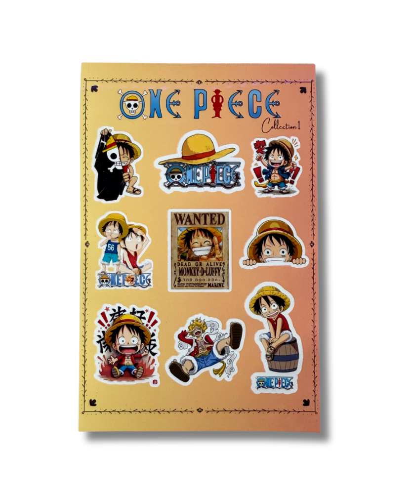 ورّي ستايلك مع ملصقات ون بيس ضد الموية – من التشكيلة الأولى! الملصقات فيها لوفي وتصاميم رهيبة بطابع الأنمي، ومثالية للجوال، اللابتوب، أو حتى قارورة الموية.
