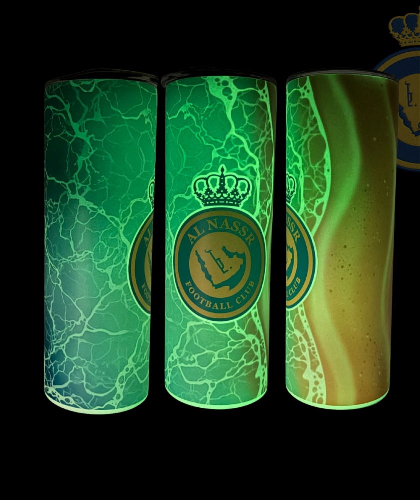 Celebrate your passion for Al Nassr Football with this exclusive 20oz glowing tumbler. Designed with the iconic blue & yellow Al Nassr colors, it features a unique UV-activated glow in the dark effect, making it stand out day and night.